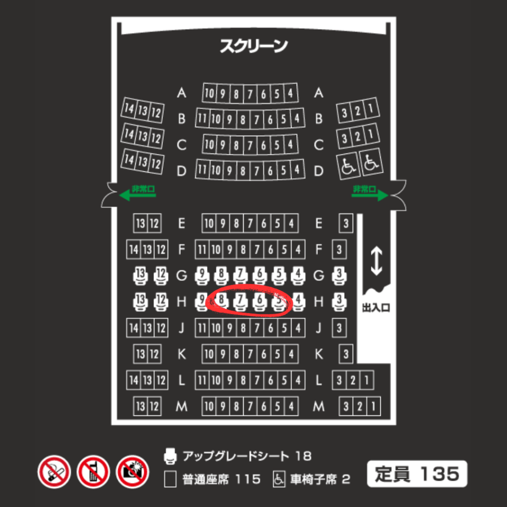 自分は実際にH列(アップグレードシート)で鑑賞したことがあるが、ベストポジションだった。1つ前のアップグレードシートのG列でも良いだろう。